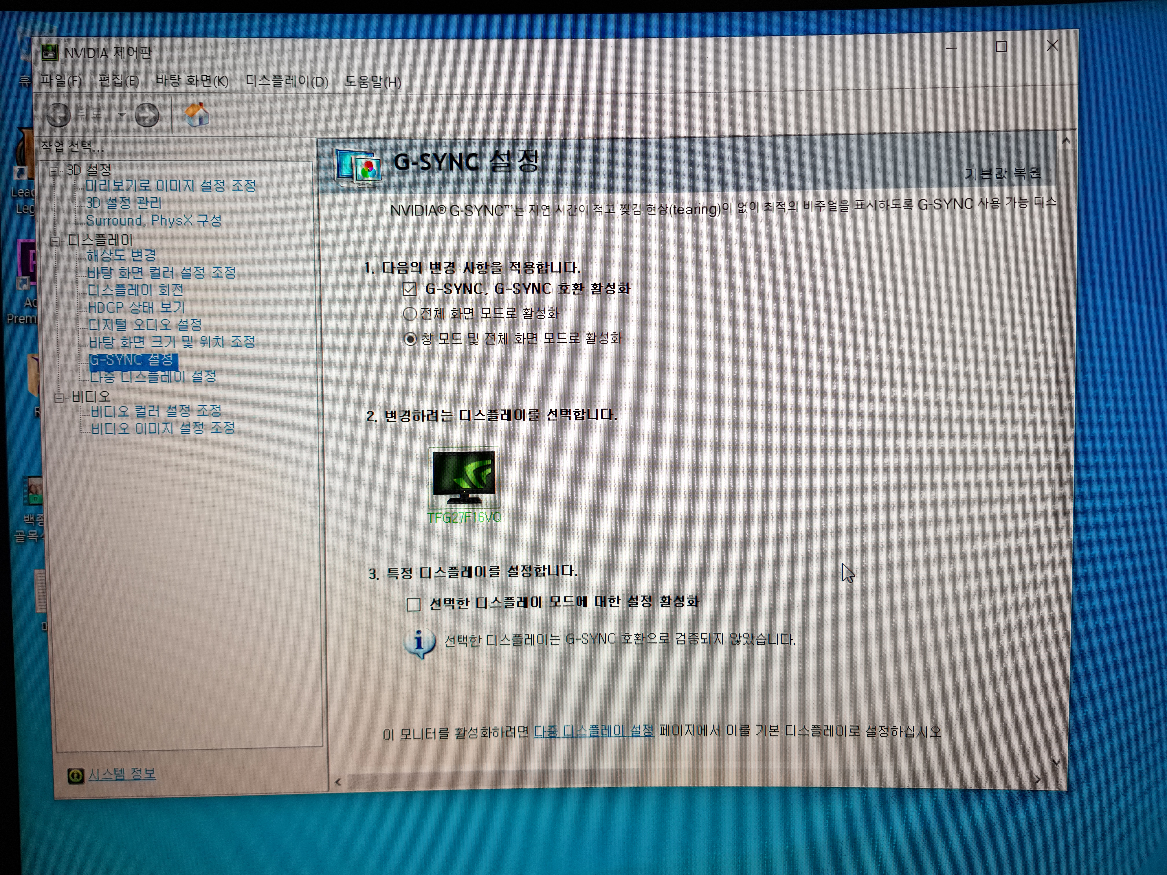 G-SYNC 호환을 사용하기 위해서는 프리싱크를 사전에 모니터에서 켜주고 재부팅을 해주어야 한다.