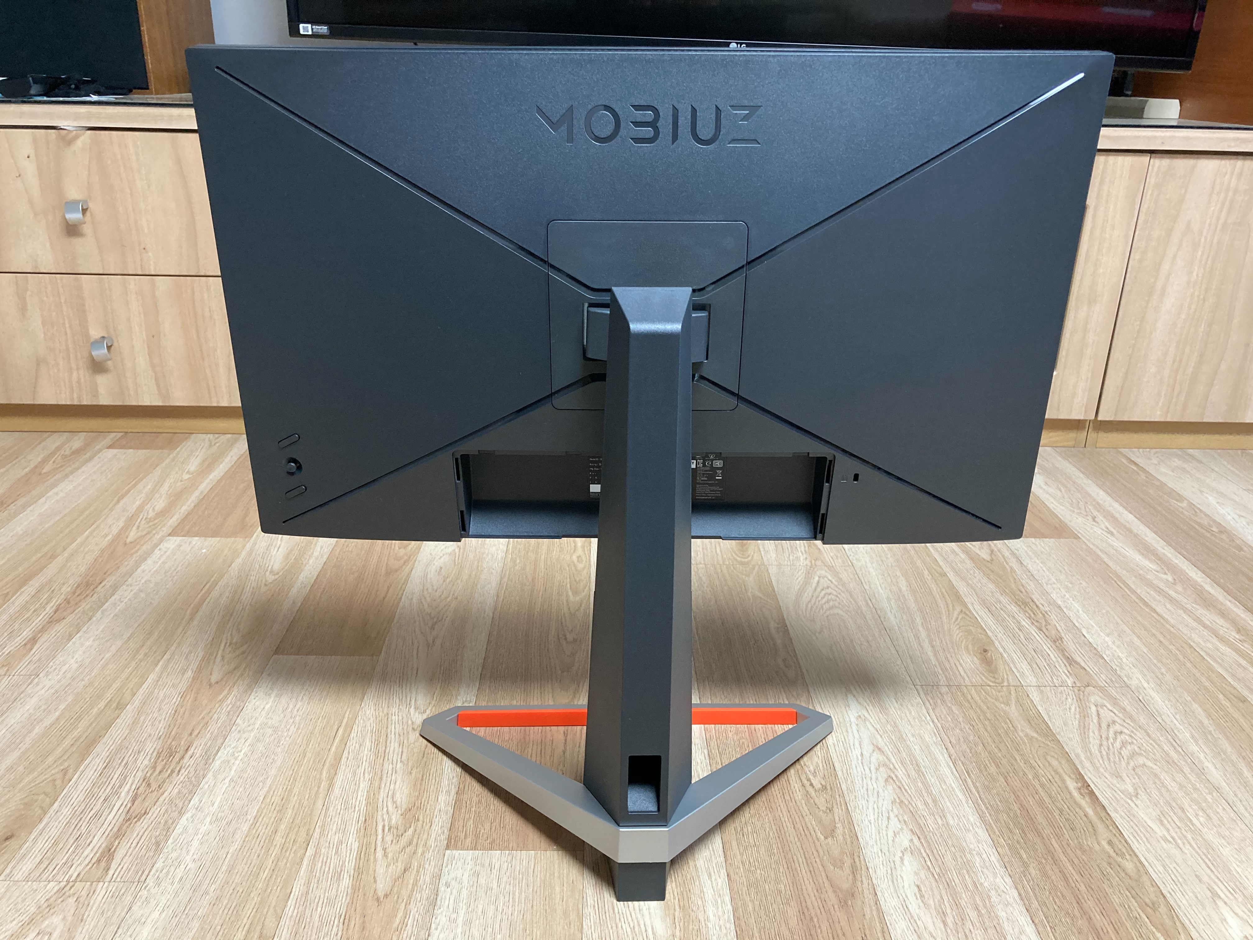 밴큐 EX2510S가 가진 포지션은 게이밍을 표방하지만, 다양한 기능과 용도를 갖추고 있기에 사용 용도에 어울리는 디자인 또한 중요하다고 할 수 있습니다. 밴큐 EX2510S는 게이밍 모니터에 볼 수 있는 입체적이고 사이버틱한 디자인이 베이스지만 동시에 주황색 고무로 포인트를 준 스틸 느낌의 스탠드를 사용하여 모던한 분위기를 같이 가져가고 있습니다. 이 때문에 게임을 할 때도 어울리고 영화나 문서 작업을 해도 어울리는 팔색조같은 미려한 디자인을 가지고 있습니다. 디자인은 물론 주관적인 영역이지만 동급의 제품 중에서 디자인이 사실상 가장 낫다고 할 정도로 누구나 보기에도 세련되면서도 무난한 디자인입니다. 스탠드에 있는 주황색 고무는 무난한 걸 좋아하는 사람이라면 거부감이 들 수도 있지만 사이버틱한 분위기를 가미시키면서도 고무라는 소재의 따뜻함이 어우러져 유니크한 감성을 더해주고 있습니다.